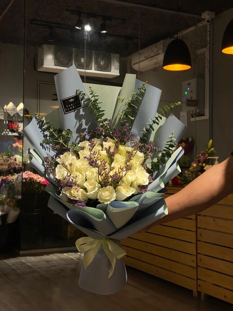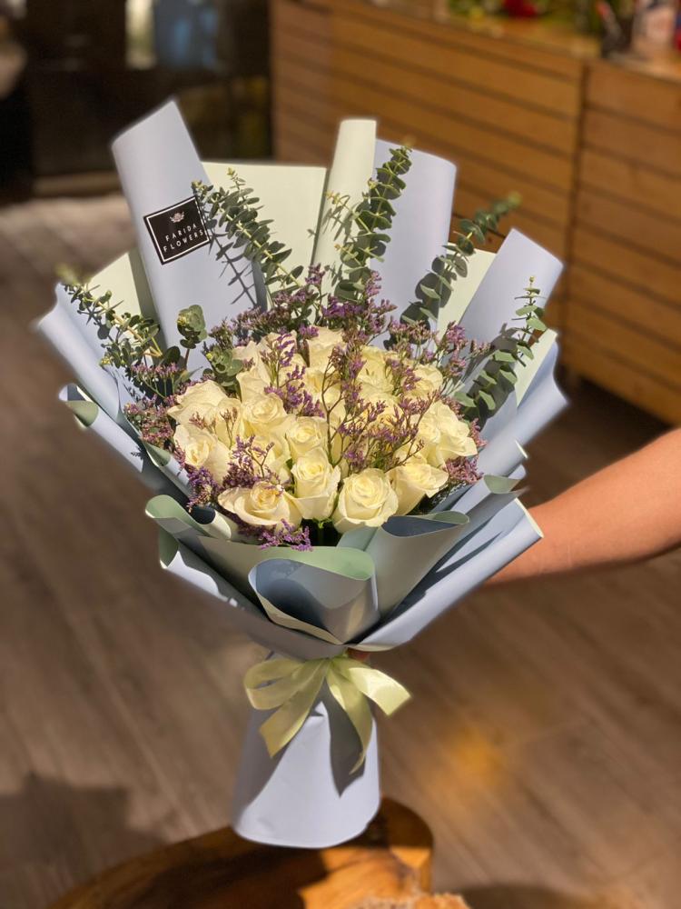 جديدنا من ورود فريدة! باقة لافندر روز تجمع بين جمال الورد الجوري الطبيعي الفاخر وأناقة أغصان الخضار المنعشة، لتضفي لمسة من الرومانسية والهدوء على يومك. تتميز هذه الباقة بتغليفها الرمادي الأنيق الذي يبرز جمال الورود ويجعلها الهدية المثالية لمن تحب.