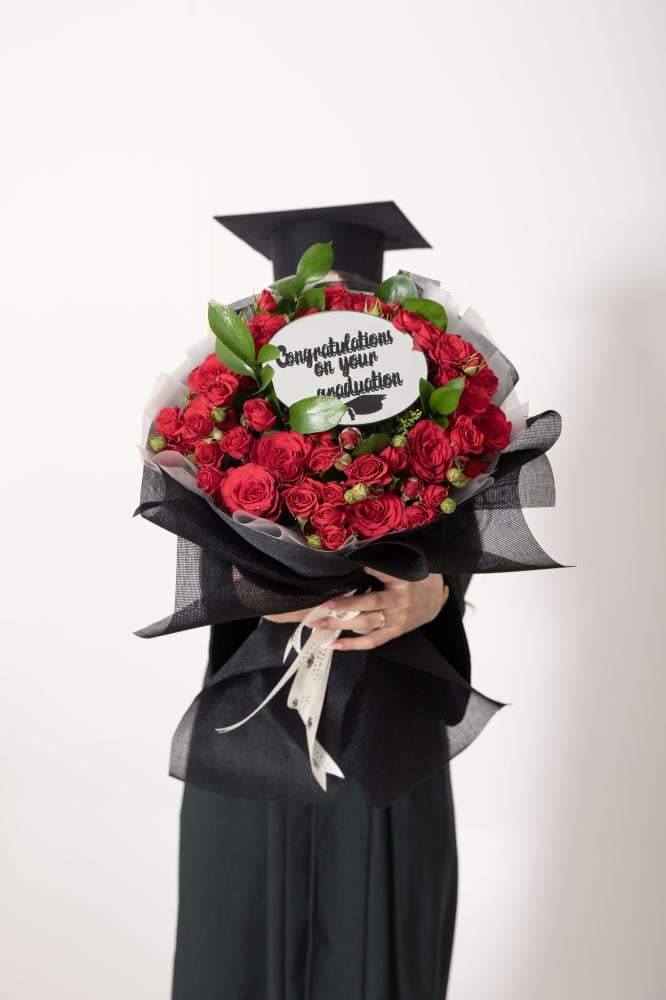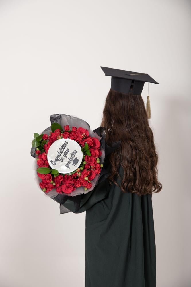 احتفل بلحظة التخرج المميزة مع باقة التخرج الأنيقة هذه من ورود فريدة! تتميز هذه الباقة بتنسيق فريد من الورد الطبيعي الأحمر الجذاب، مع لمسة عصرية من المرايا التي تحمل عبارة "Congratulations on your Graduation". 🌹