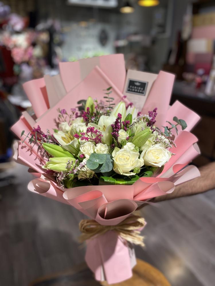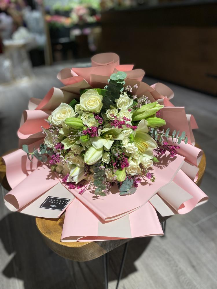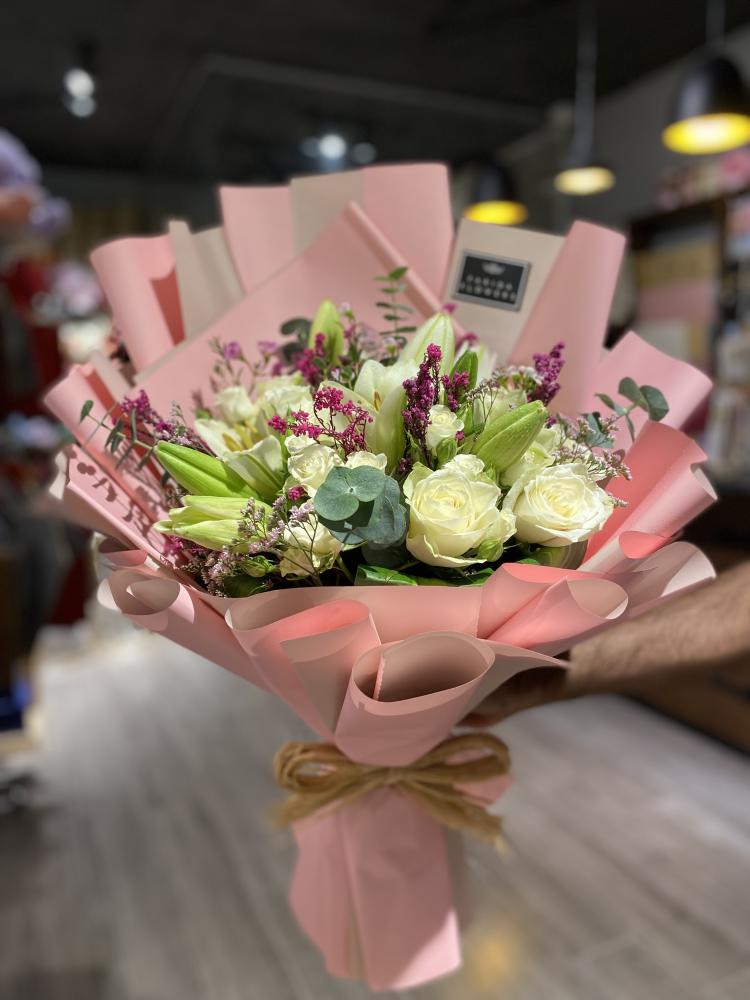 باقة أحلام الجديدة من ورود فريدة، باقة تالا تأسر الحواس بجمالها الأخاذ. تتميز هذه الباقة الرائعة بتنسيق فريد من الورد الجوري الطبيعي باللون البينك الناعم والأبيض النقي، مع لمسة منعشة من الأزهار الخضراء التي تضفي عليها حيوية وجمالاً طبيعياً.