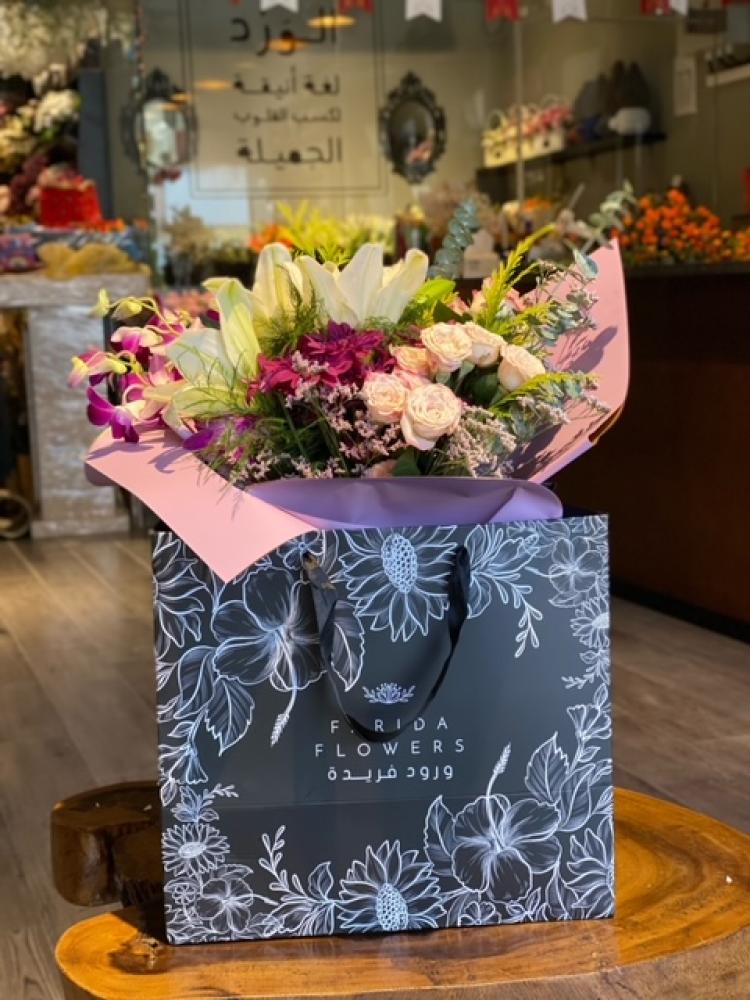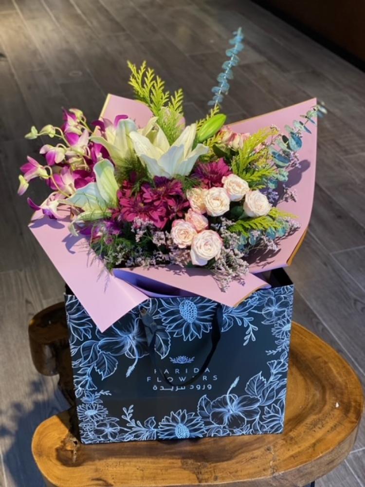 دلّل أحبائك بباقة ورود فريدة ٣، تحفة فنية تجمع بين جمال الطبيعة وأناقة التصميم. تأتي هذه الباقة الرائعة منسقة داخل كيس كرتوني أنيق يحمل شعار ورود فريدة، مما يجعلها هدية مثالية لكل المناسبات. استمتع بعبير الورد الطبيعي البيبي روز باللون البينك الفاتح دبل كلر، والكريز الموف، والكازابلانكا الفاخرة، بالإضافة إلى أغصان الكالبتوس الخضراء المنعشة، واللومينا الموف الجذابة، وزهرة الأوركيد باللون الموف الأنيق 💜.