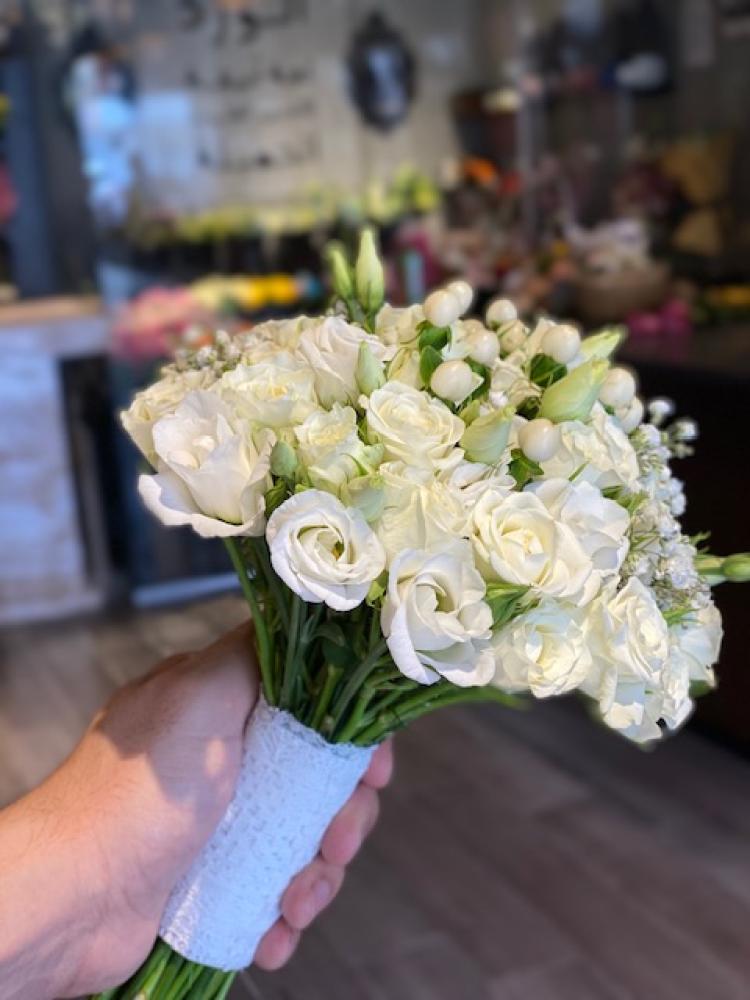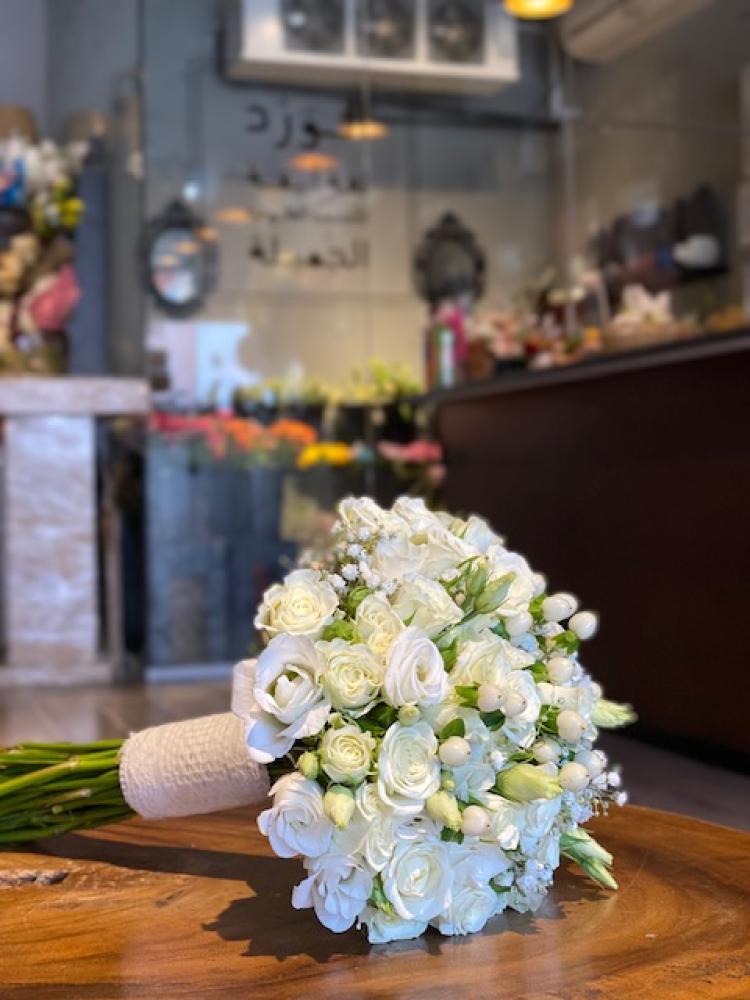 مسكة ساجدة، تحفة فنية تجمع بين الرقة والأناقة لتتألقي بها في يوم زفافك. تم تنسيق هذه المسكة الرائعة بعناية فائقة من أجود أنواع الورود، بما في ذلك البيبي روز، والهيبركوم، والجيبسوفبلا، والاستوما باللون الأبيض الناصع 🤍. هذه التشكيلة المتناغمة تخلق إطلالة ساحرة تضفي عليكِ جمالاً لا يُنسى وتكمل فستان زفافك بأبهى صورة.