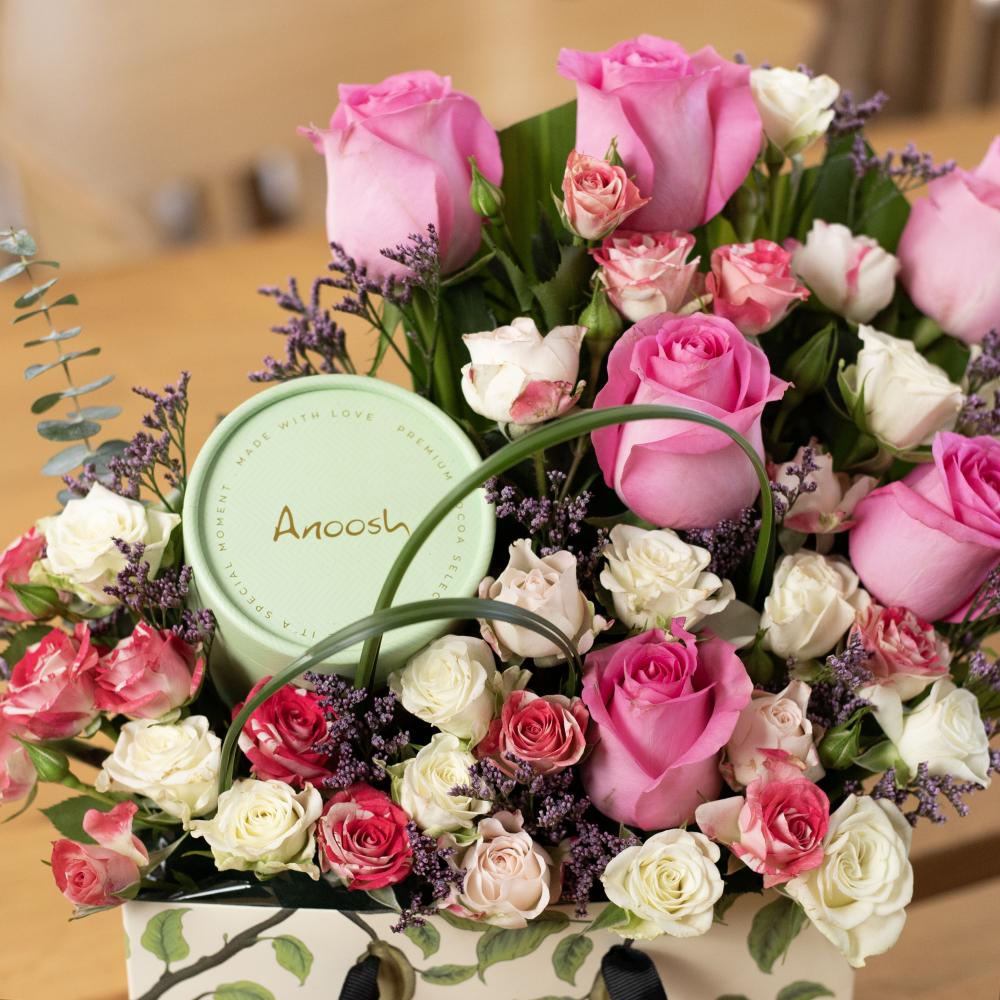 دلّل أحبائك بتنسيق ورد وشوكلت أنوش 2 الرائع! هذا التنسيق الفريد يجمع بين جمال الورد الطبيعي الفاتن وشوكولاتة أنوش البلجيكية الفاخرة، ليخلق تجربة لا تُنسى. استمتع بتوليفة ساحرة من الورد الطبيعي باللون الموف والأبيض، يتألق بجمال الجوري والكريز، مُكمّلة بقطع شوكولاتة أنوش البلجيكية الغنية. 🍫