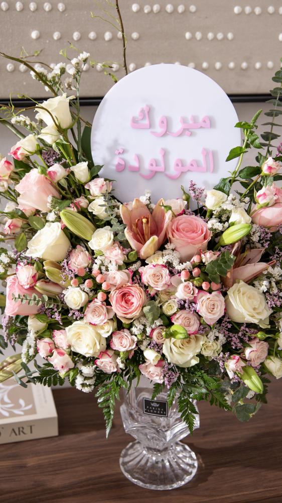 تتميز الفازة بعبارة "مبروك المولودة" المصنوعة من الأكريليك الفاخر، مما يضيف لمسة شخصية ومميزة للهدية. الورد الطبيعي المستخدم في التنسيق تم اختياره بعناية لضمان جودته ونضارته، مما يجعله هدية تدوم طويلاً وتبقى ذكرى جميلة لهذه المناسبة السعيدة. 💖